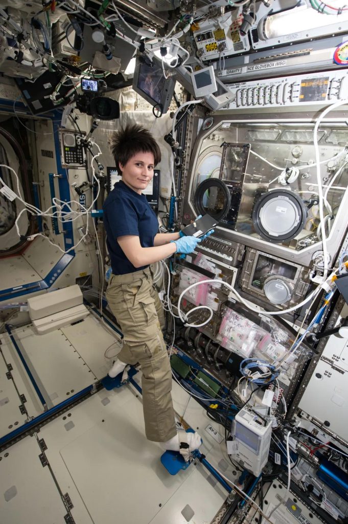 A képen Samantha Cristoforetti, az ESA (Európai Űrügynökség) űrhajósa a 3D nyomtatóval dolgozik az űrállomás fedélzetén.